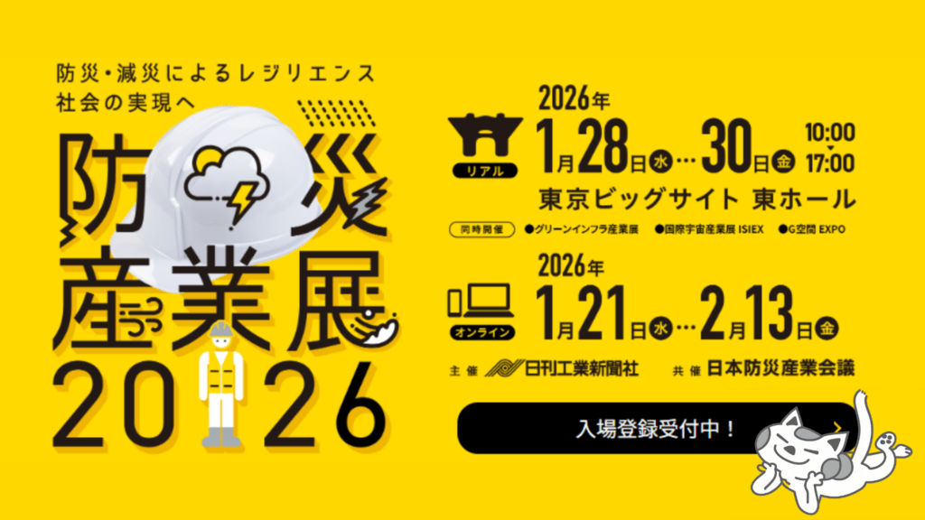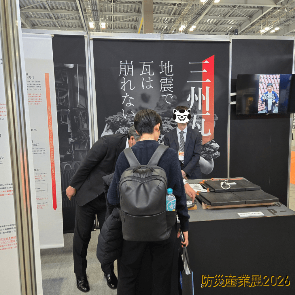 TOPICS 全て 野安株式会社 NOYASU Co.,Ltd. > 全て > 防災産業展2026に出展しました!! 全て 防災産業展2026に出展しました!! 2026.01.30 防災産業展2026に愛知県陶器瓦組合が出展しました。 陶器瓦の耐震についてや防災瓦について展示し 陶器瓦が どのように進化して災害に強くなったのかを分かりやすくご紹介しています。 開催場所 東京ビッグサイト 東ホール 開催日時 2026年1月28日~1月30日 10:00~17:00 展示場所 7B-41 ぜひお越しくださいませ。 一覧へ戻る おすすめ記事 全て 2023年新年会を開催しました!! 全て セラフラットⅢ CFⅢ-NⅡ リニューアル発売のご... 全て 東京支店を移転し、東京OFFICEへ名称変更しまし... 全て 社長がYouTubeで瓦についてお話しています!! 全て セラマウントCM-NⅡの施工の様子をご覧ください。 全て ご注文受付に関するリードタイムのお願い ニュース全て瓦猫瓦猫販売店 インターペットに出展しました!! 全て 三州瓦とSDGs 全て 夏季休業のお知らせ 全て 東北営業所閉鎖のご挨拶 おすすめニュース全て瓦猫瓦猫販売店 瓦猫ショールームが完成しました!! 全て セラマウントのカタログページを更新しました!! 全て 商品の外部委託生産に伴う生産終了及び仕様改訂・廃色... 全て 生産終了製品のご案内 全て HPのカタログに新商品セラフラットプラス1を追加し...